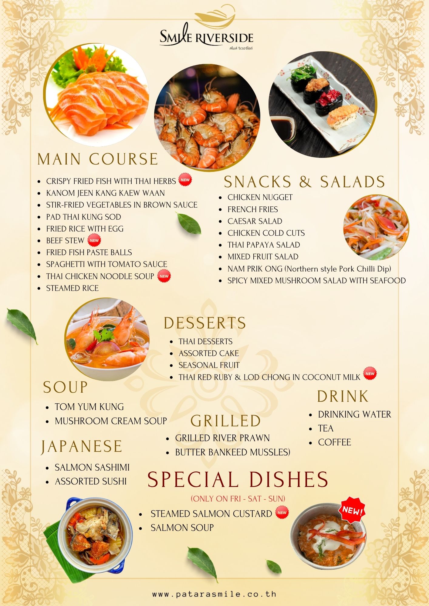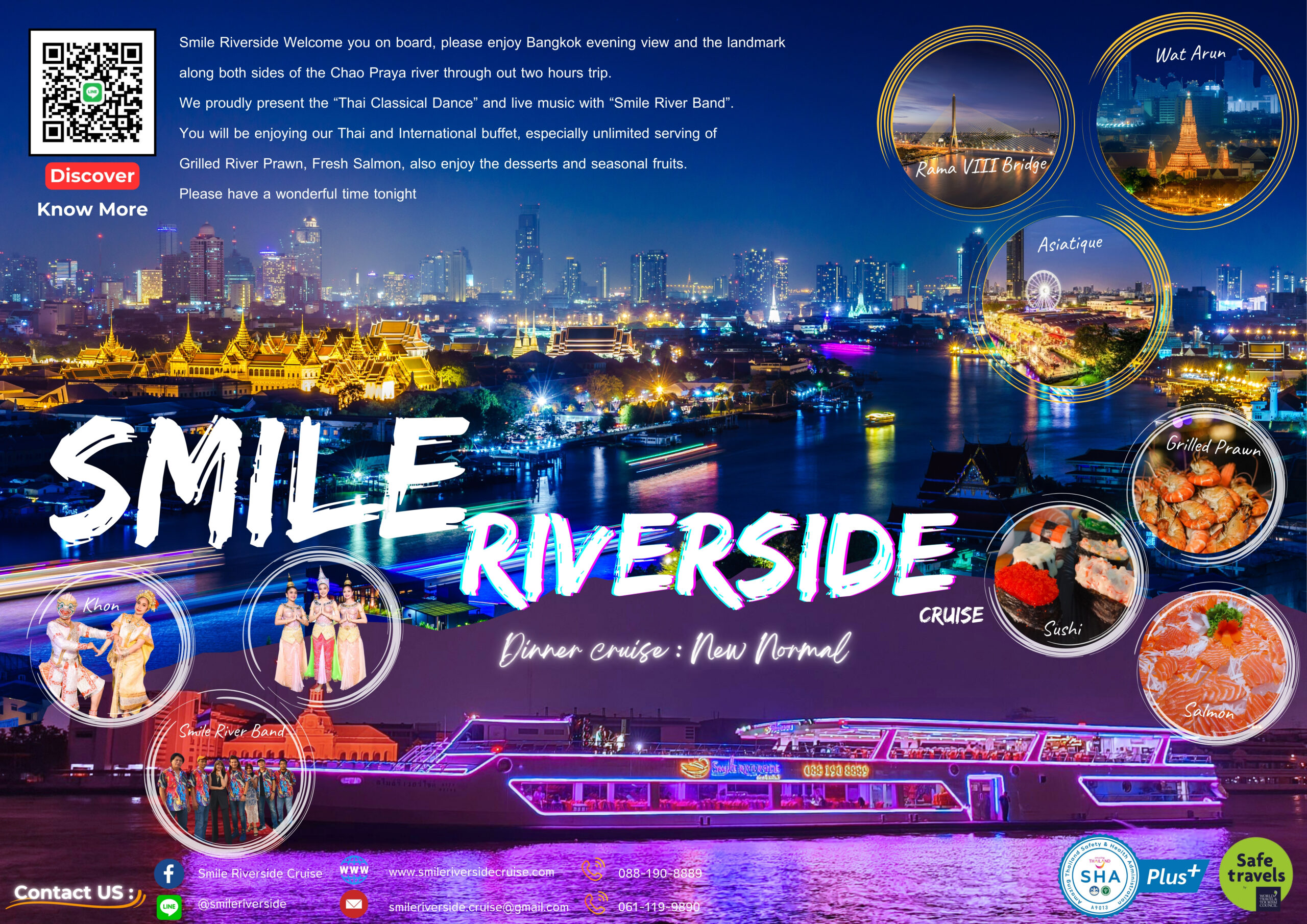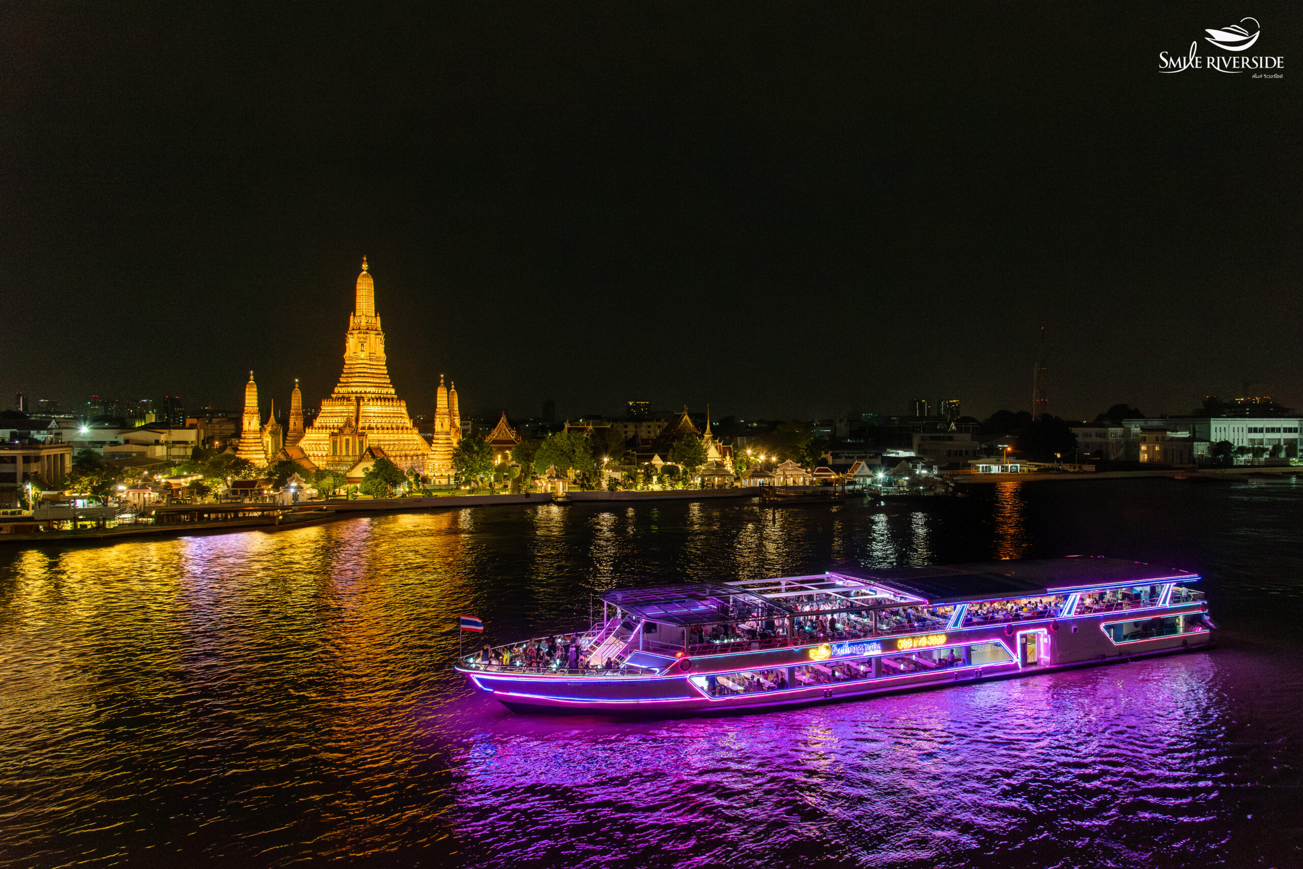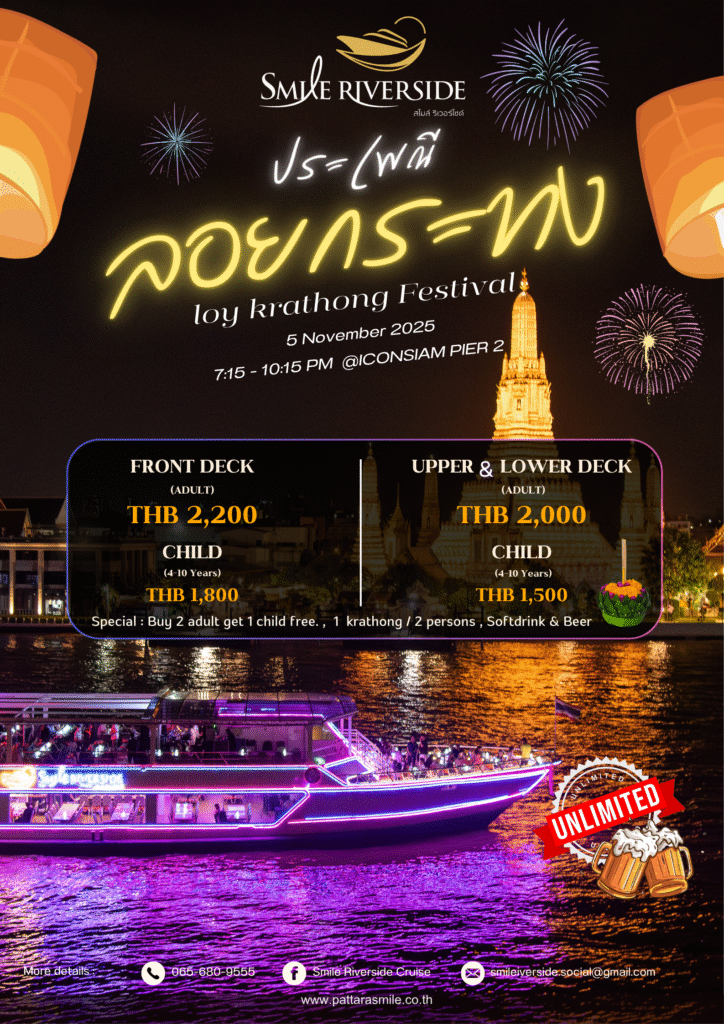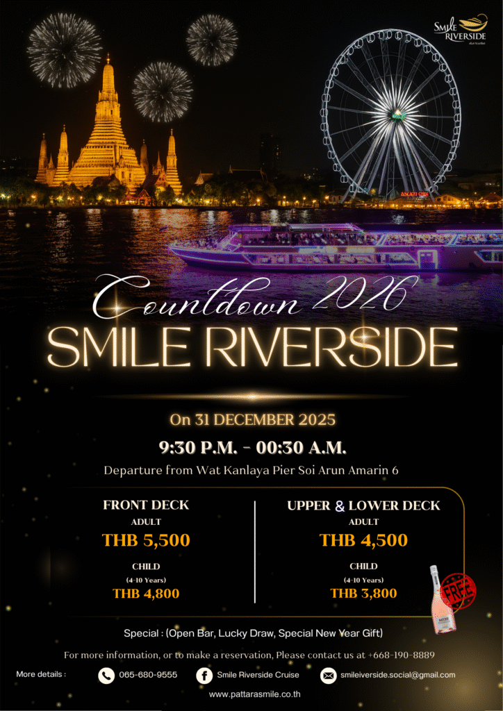 หากกำลังมองหาสถานที่รับประทานอาหารเย็นในบรรยากาศล่องเรือในแม่น้ำเจ้าพระยา พร้อมกับชมทิวทัศน์ที่สวยงามทั้งแบบสถาปัตยกรรม ประติมากรรม และวิถีชีวิตของชาวกรุงสองฝั่งลำน้ำ เราขอแนะนำนี่เลย เรือ Smile Riverside (สไมล์ ริเวอร์ไซด์) เรือสำราญ 2 ชั้น สามารถจุผู้โดยสารได้ถึง 380 ท่าน โดยชั้นที่ 1 เป็นระบบปรับอากาศเย็นสบาย ชั้นที่ 2 เปิดโล่งรับอากาศแบบธรรมชาติแบ่งเป็น 2 ส่วน ส่วนท้ายเรือมีหลังคา ส่วนที่ 2 บริเวณด้านหน้าและหัวเรือไม่มีหลังคา ท่านจะได้รับความเพลิดเพลินกับบรรยากาศ การแสดงสดบนเรือ เต็มอิ่มกับอาหารในแบบบุฟเฟต์นานาชาติ ตลอดการเดินทาง 2 ชั่วโมงท่านสามารถเช็คอินได้ก่อนเวลา 18:00 น. ที่ห้องขายตั๋วของเรือ Smile Riverside ตั้งอยู่บริเวณชั้น G ของ Icon Siam จากนั้นมารอลงเรือที่ท่าเรือ 2 เมื่อท่านลงเรือจะมี Welcome Drink ไว้ต้อนรับ นอกจากนี้ ยังมีอาหารในแบบบุฟเฟต์นานาชาติ พร้อมผลไม้ และของหวานหลากหลายรายการ อาทิเช่น กุ้มแม่น้ำเผา หอยชิลีอบชีส ปลาแซลมอนสด เป็นต้น ในส่วนของการแสดงสดจะมีวงดนตรี Smile River Band การรำต้อนรับ การแสดงโขน และการเต้นละติน ของเหล่านักแสดงมืออาชีพไว้ให้ท่านได้ชมอย่างจุใจ