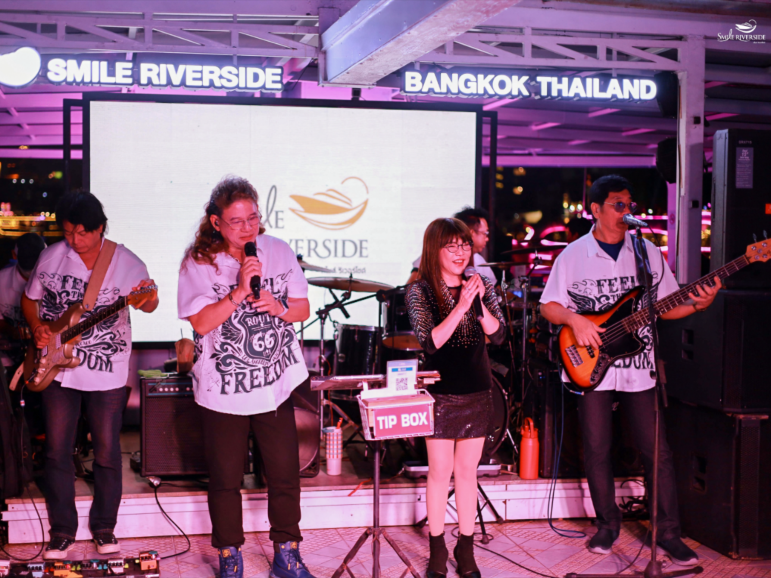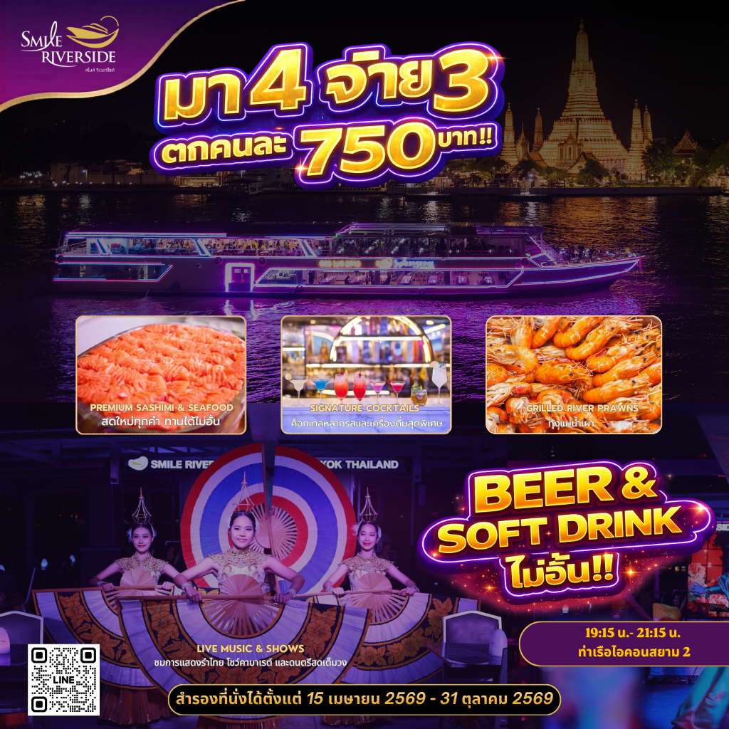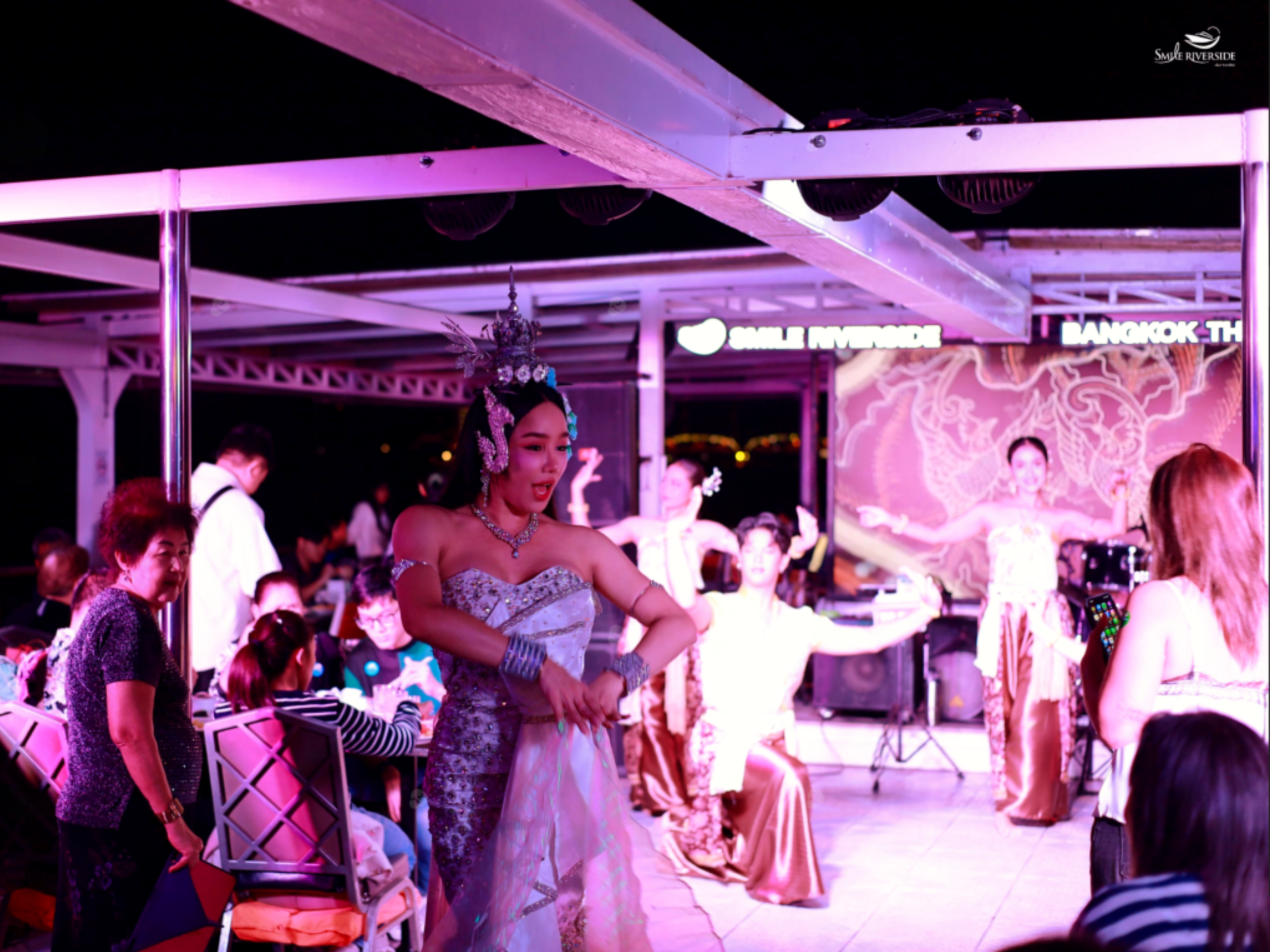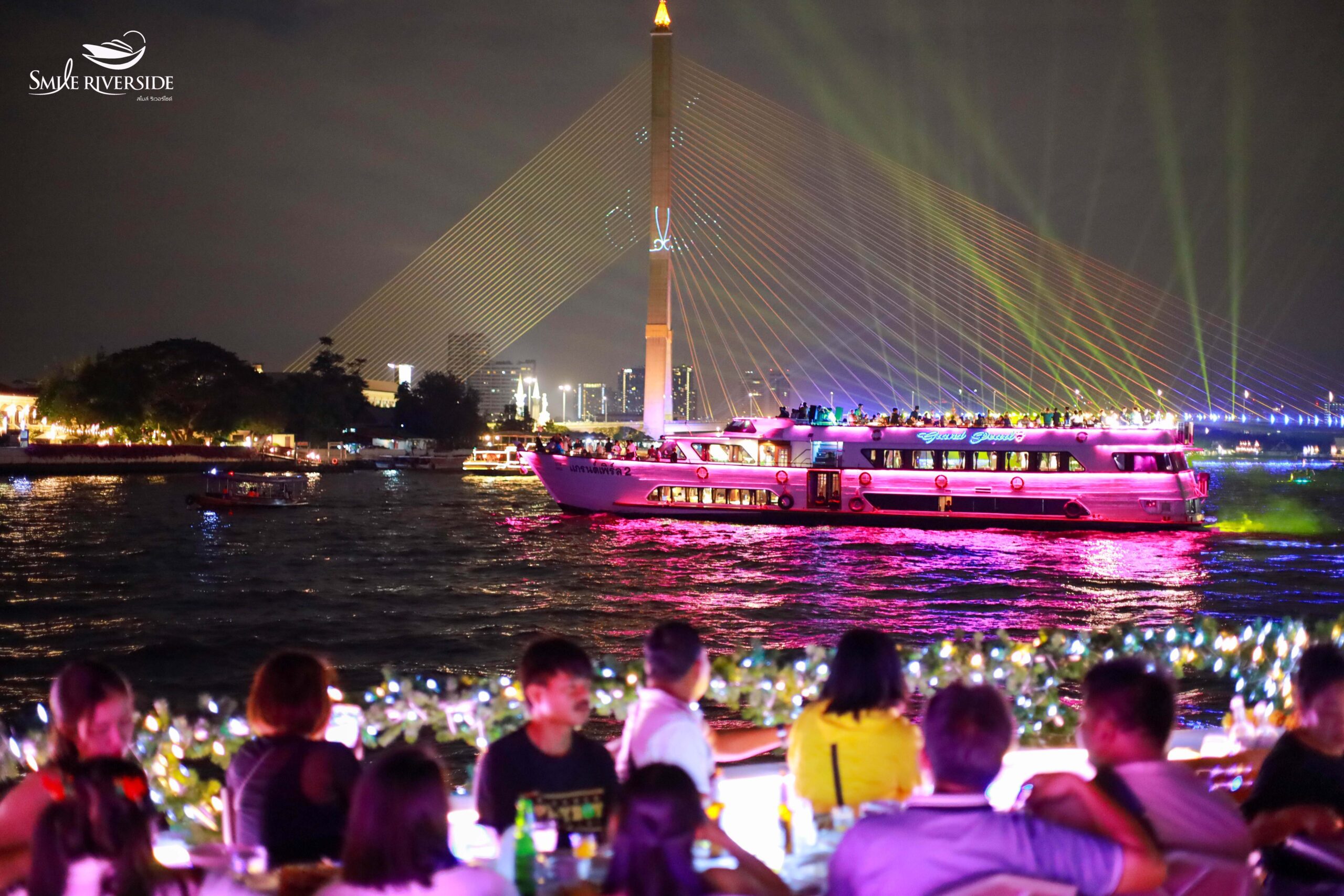 หากกำลังมองหาสถานที่รับประทานอาหารเย็นในบรรยากาศล่องเรือในแม่น้ำเจ้าพระยา พร้อมกับชมทิวทัศน์ที่สวยงามทั้งแบบสถาปัตยกรรม ประติมากรรม และวิถีชีวิตของชาวกรุงสองฝั่งลำน้ำ เราขอแนะนำนี่เลย เรือ Smile Riverside (สไมล์ ริเวอร์ไซด์) เรือสำราญ 2 ชั้น สามารถจุผู้โดยสารได้ถึง 380 ท่าน โดยชั้นที่ 1 เป็นระบบปรับอากาศเย็นสบาย ชั้นที่ 2 เปิดโล่งรับอากาศแบบธรรมชาติแบ่งเป็น 2 ส่วน ส่วนท้ายเรือมีหลังคา ส่วนที่ 2 บริเวณด้านหน้าและหัวเรือไม่มีหลังคา ท่านจะได้รับความเพลิดเพลินกับบรรยากาศ การแสดงสดบนเรือ เต็มอิ่มกับอาหารในแบบบุฟเฟต์นานาชาติ ตลอดการเดินทาง 2 ชั่วโมงท่านสามารถเช็คอินได้ก่อนเวลา 18:00 น. ที่ห้องขายตั๋วของเรือ Smile Riverside ตั้งอยู่บริเวณชั้น G ของ Icon Siam จากนั้นมารอลงเรือที่ท่าเรือ 2 เมื่อท่านลงเรือจะมี Welcome Drink ไว้ต้อนรับ นอกจากนี้ ยังมีอาหารในแบบบุฟเฟต์นานาชาติ พร้อมผลไม้ และของหวานหลากหลายรายการ อาทิเช่น กุ้มแม่น้ำเผา หอยชิลีอบชีส ปลาแซลมอนสด เป็นต้น ในส่วนของการแสดงสดจะมีวงดนตรี Smile River Band การรำต้อนรับ การแสดงโขน และการเต้นละติน ของเหล่านักแสดงมืออาชีพไว้ให้ท่านได้ชมอย่างจุใจ